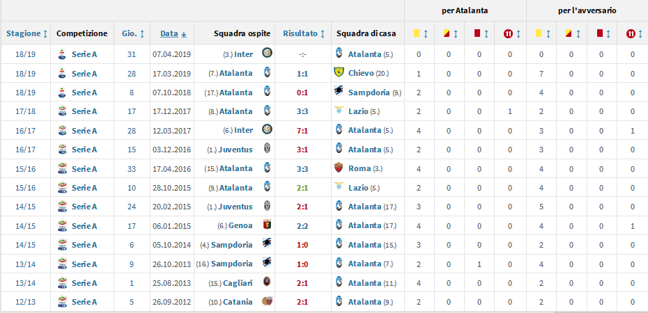 Di seguito il dettaglio delle partite dell'Atalanta arbitrate da Irrati (clicca sull'immagine per vederla nelle dimensioni originali - fonte dati transfermarkt.it)