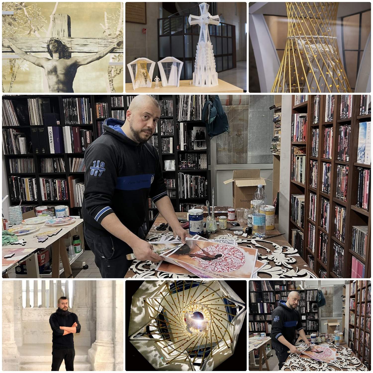 Per un artista come Andrea Mastrovito è più facile disegnare che raccontare. Nel suo studio si guarda attorno, trova un gesso, e mentre parla del suo rapporto con la Chiesa e con l’arte, con l’umano e il divino, con il passato e il futuro, traccia poche linee su un tavolo di legno. Compare così il suo Agnus dei, un agnello simbolo di Gesù Cristo che diventerà una scultura formata da migliaia di schegge di vetro, incastonato in raggi luminosi intrecciati a forma di iperboloide iperbolico, una sorta di cilindro torto e avviluppato su se stesso, come alcuni cestini per la carta. Quell’agnello e quell’iperboloide saranno al centro di un’enorme croce nel punto più alto della chiesa più alta al mondo, la Sagrada Familia di Barcellona.