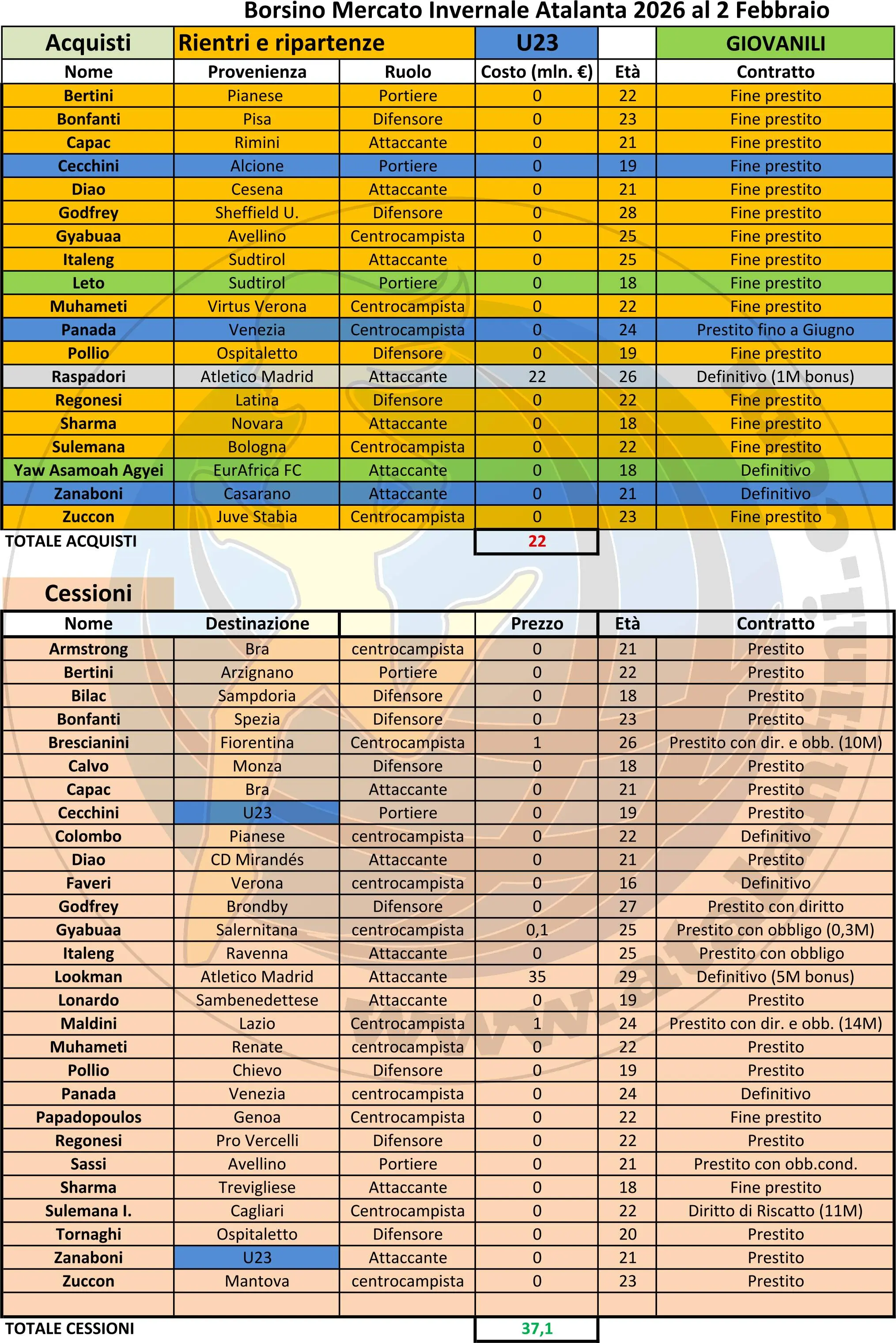 Ecco nel dettaglio il borsino con tutti i movimenti in entrata e uscita dell'Atalanta, il più completo possibile, per la sessione invernale del 2026.