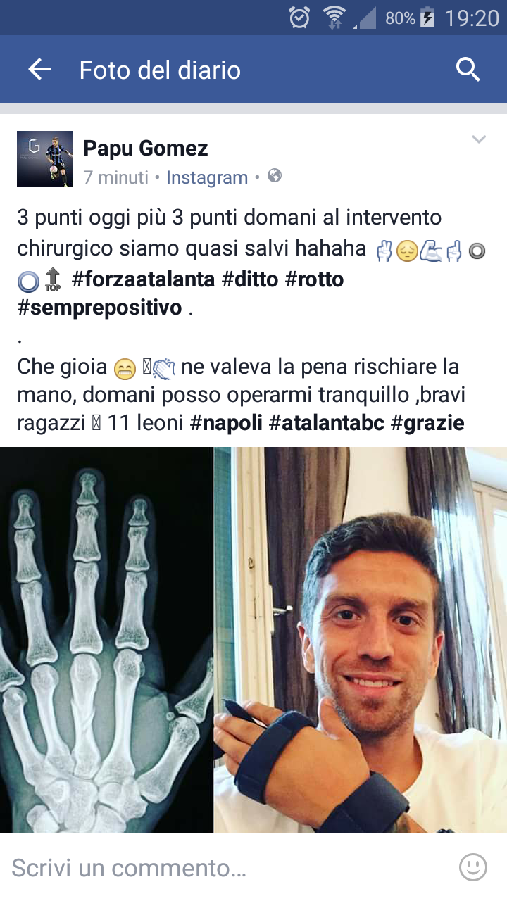 Ecco Gomez su facebook felice e determinato in vista dell'operazione alla mano infortunata a Pescara lunedi. ..