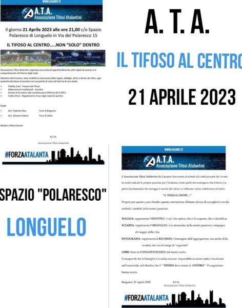 ATA organizza questa sera alle 21 c/o Spazio Polaresco di Longuelo in via del Polaresco 15 una serata di approfondimento sulle regole di accesso e di comportamento all'interno degli stadi.