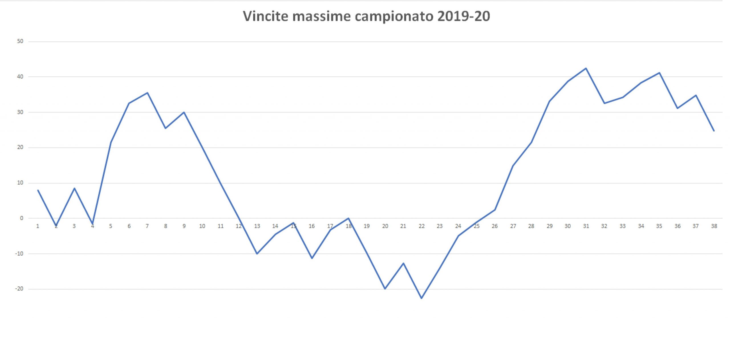 Il picco massimo si riscontra dopo la partita con la Sampdoria (ultima del filotto di vittorie) a 27,7€, il picco minimo a -28,7€ dopo l'incontro con il Genoa.