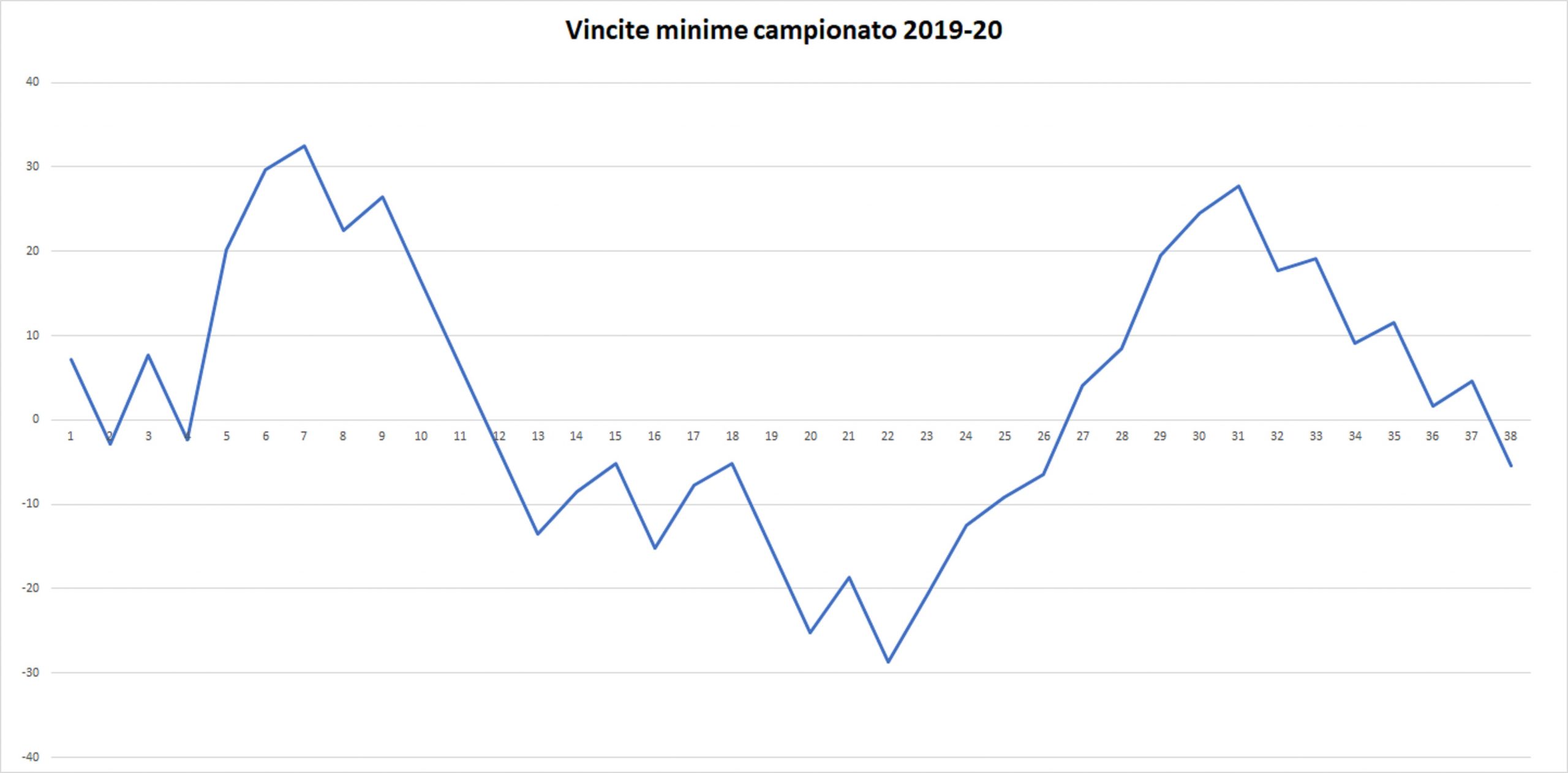 Anche in questo caso dopo un alternarsi di segno delle prime giornate, la saccoccia del tifoso è sempre piea fino alla partita con la Sampdoria dopo la quale il saldo è a 0. La successive partita con la Juventus vede iniziare una serie di saldi negativi fino a quando il segno volge al + seppure di poco (0,1€) dopo il match di andata col Parma. A seguire altre 7 partite che lasciano il saldo in negativo. Il termine del lockdown e la partita col Sassuolo, riportano il saldo in verde (+2,4€) e da li non cambierà più segno.