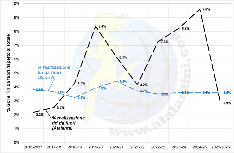 Insomma, l’Atalanta è sempre stata sotto la media della Serie A per la percentuale di tiri da fuori area rispetto a quelli totali negli ultimi 10 anni. Ossia, rispetto alle altre squadre privilegiava molto di più i tiri negli ultimi 16 metri. Per cui, quella sensazione di “avversione” al tiro da fuori da parte dei nerazzurri sembra essere confermata dai dati.