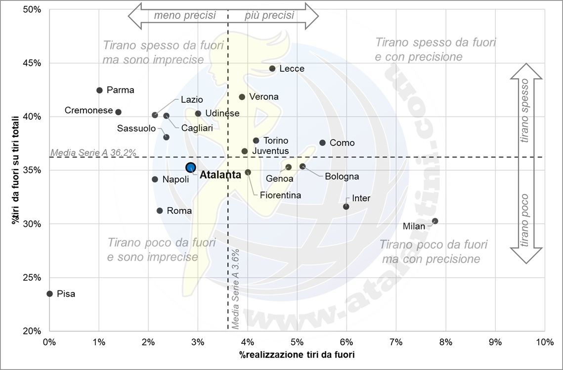 L’ultimo grafico ci mostra che infatti purtroppo attualmente siamo nel club di quelli “poco precisi” (la parte sinistra del grafico) dopo anni di onorata presenza nel gruppo dei cecchini, seppur refrattari alla pratica (il quadrante in basso a destra del grafico). Tra l'altro va detto che anche in senso assoluto tiriamo molto da fuori area, siamo quarti con 105 tentativi totali dalla distanza, dietro a Juve (127) Inter (117) e Como (107), tutte squadre però più precise di noi.