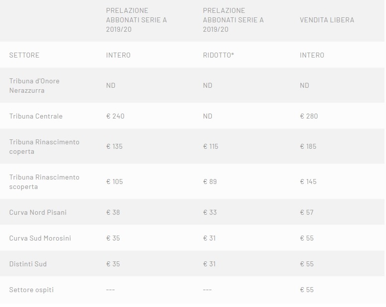 Tribuna Centrale € 240 ND € 280