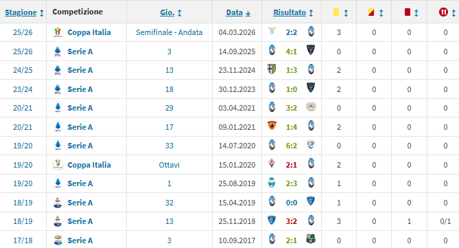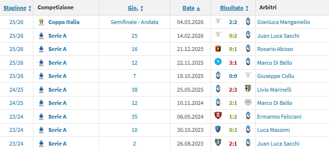 Tredicesima presenza da arbitro per Manganiello con l'Atalanta tra cui la recente semifinale di andata di Coppa Italia