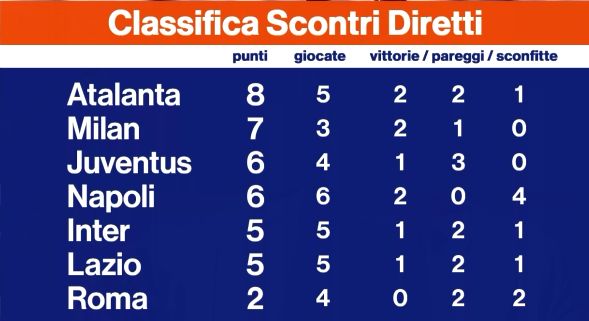 Questa la schermata pubblicata ieri sera da "Calcio totale" della RAI e relativa agli scontri diretti tra le grandi sin qui disputati in campionato