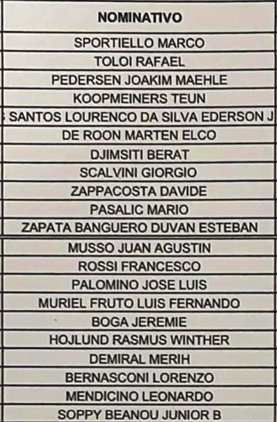 ATALANTA (3-4-2-1): Sportiello; Toloi, Djimsiti, Scalvini; Zappacosta, De Roon, Ederson, Maehle; Koopmeiners, Pasalic; Zapata. Allenatore: Gian Piero Gasperini