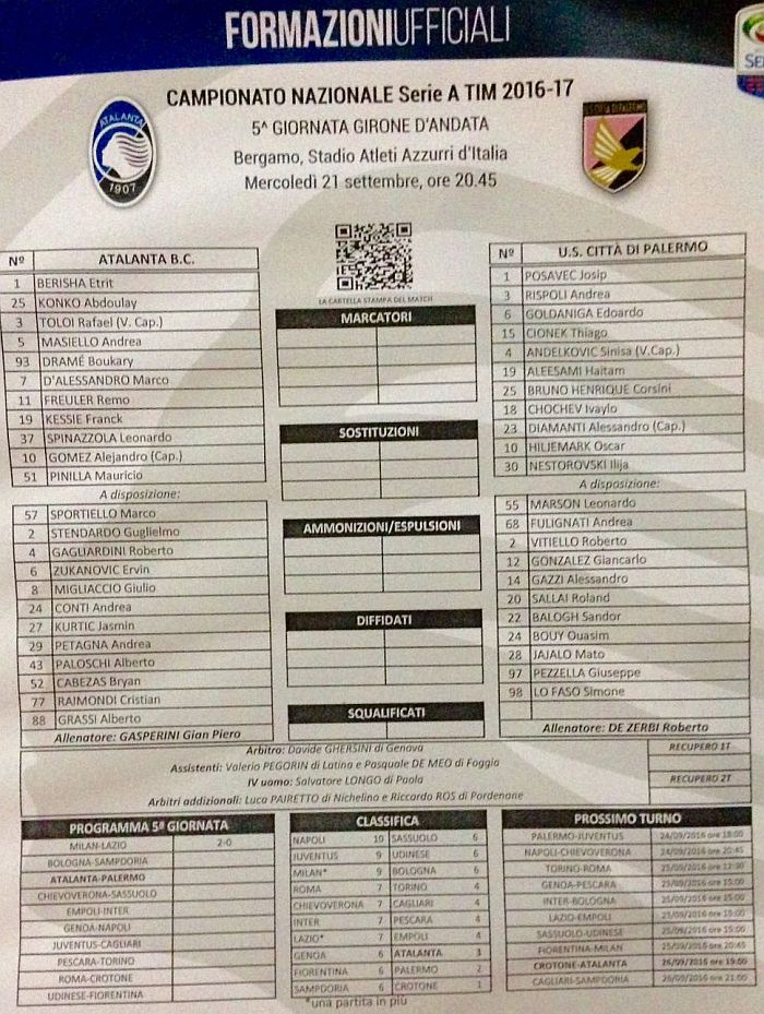 La videoformazione nerazzurra in Atalanta-Palermo. Diamanti capitano rosanero