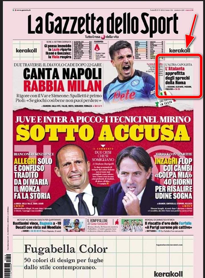 Magari ci sbagliamo, magari sono manie persecutorie di noi provincialotti ma, a parte lo spazio riservato (un minimo, ma proprio minimo, fisiologico nonostante l'impresa dell'Olimpico) ci chiediamo se sarebbe mai accaduto il contrario, definendo il Napoli (o il Milan se avesse vinto) l'"altra" capolista.