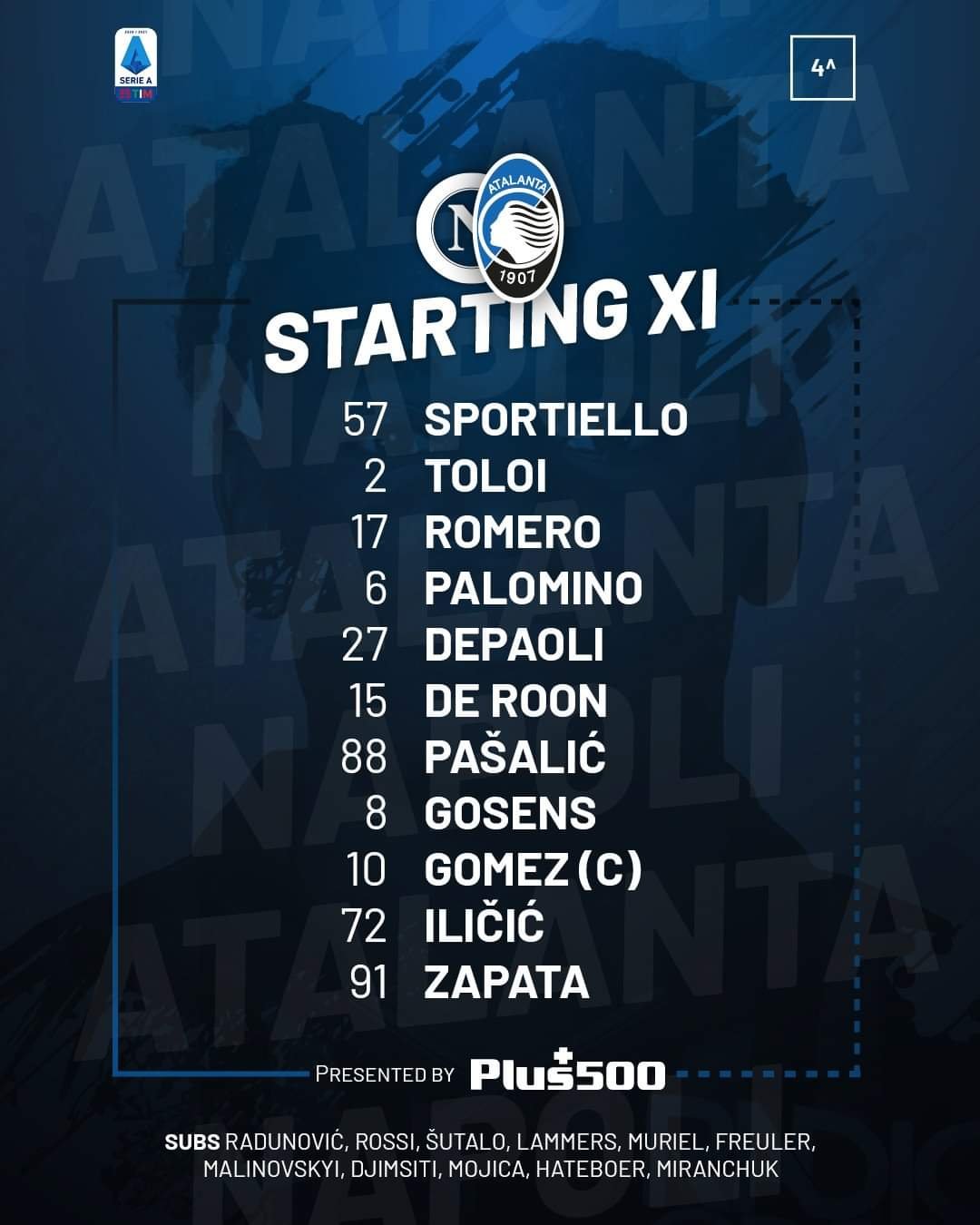 ATALANTA (3-4-1-2) – Sportiello; Toloi, Palomino, Romero; Depaoli, de Roon, Pasalic, Gosens; Gomez; Ilicic, Duvan Zapata.
