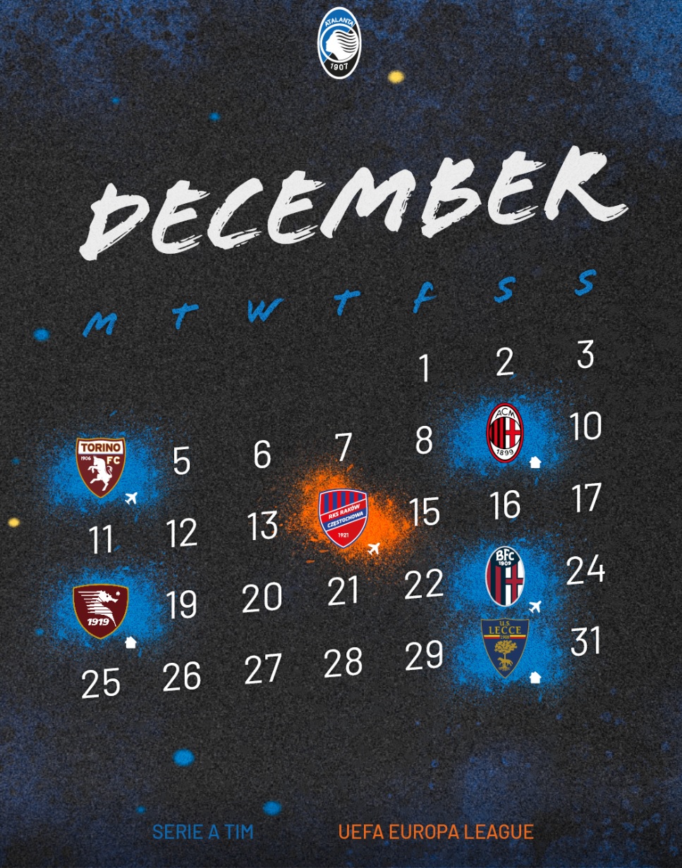03/12/2023 | 13.15 11 Le partite di dicembre Mese intenso anche dicembre con 5 partite di campionato ed una, l'ultima del girone di EL in Polonia. fonte IG atalantabc By brignuca