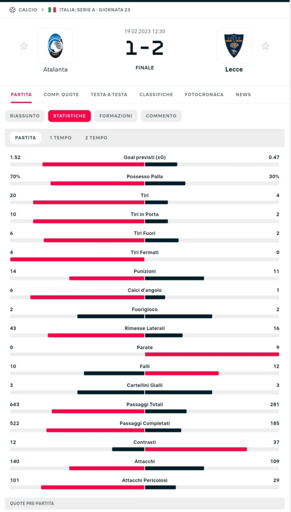 Le statistiche di Atalanta - Lecce
