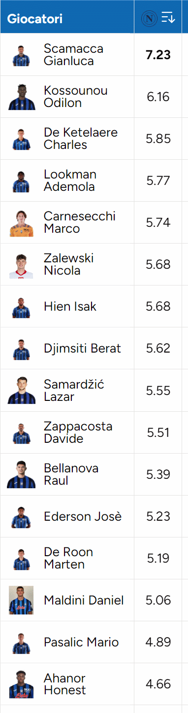 Secondo i nostri lettori sono solo 2 quelli salvatisi dalla sconfitta di Napoli. Nettamente migliore il redivivo Gianluca Scamacca (7.23 di media) la cui entrata nel secondo tempo ha sicuramente contribuito a sollevare l'apatia dei compagni nel primo tempo. Ha realizzato un gol bellissimo ed e' sembrato ispirato su ogni pallone toccato.