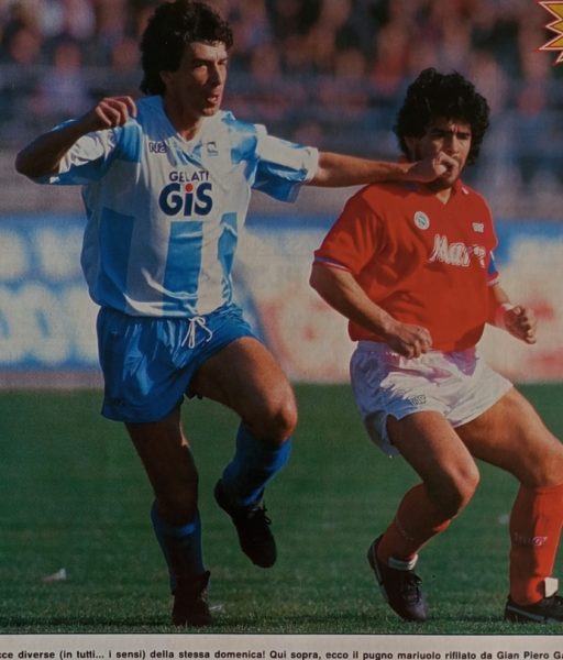 In questa foto lo vediamo marcare in maniera arcigna il Pibe in una gara del campionato di Serie A. 1988-1989. La gara fini 0 - 0 anche grazie alla sua applicata marcatura.