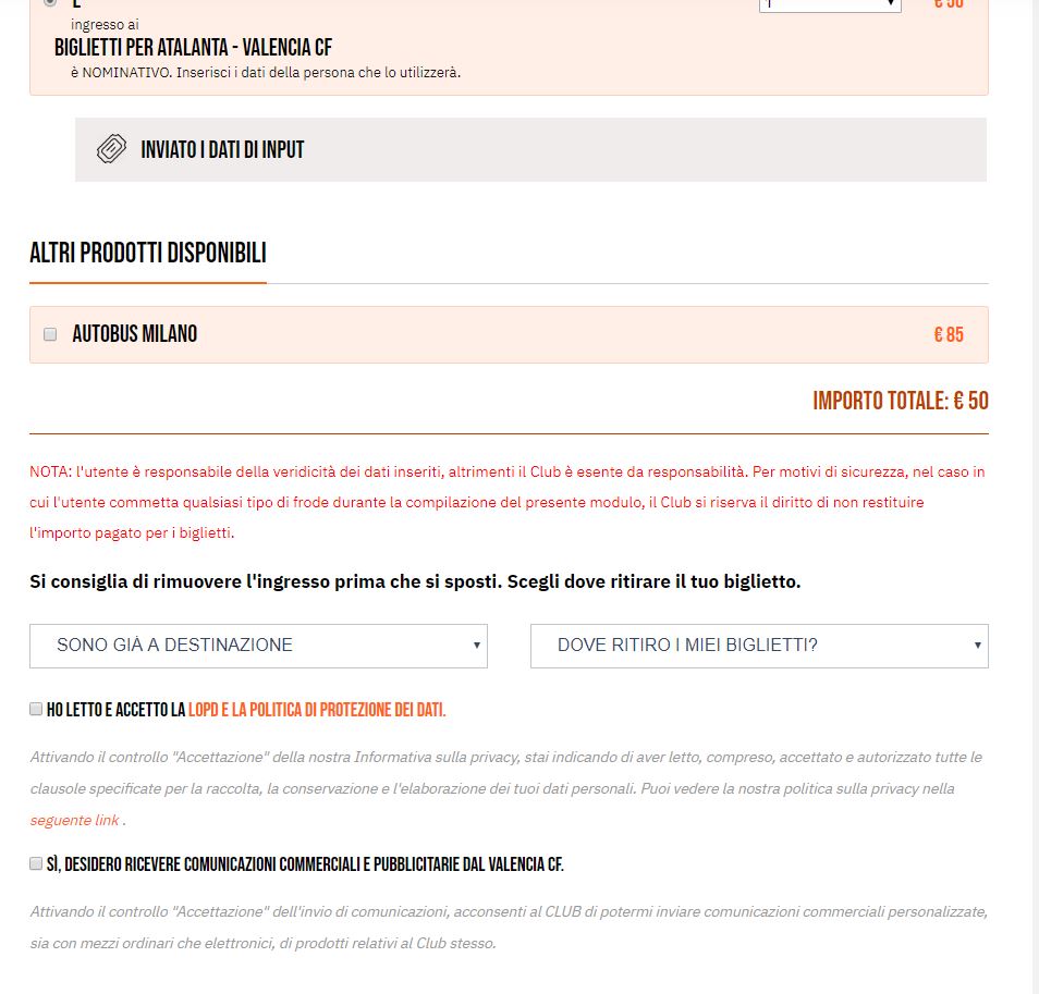 visto che ho letto e commentato l'articolo riguardante i biglietti in vendita per Milano per i tifosi del Valencia, vi allego uno screenshot del sito del Valencia: se uno prova a comprare il biglietto, può scegliere se acquistare il viaggio o meno, non lo ritengo un dettaglio da poco, o almeno è un argomento di discussione mica da ridere, e se una persona legge sommariamente l'articolo balza giusto all'occhio una notizia falsa, cioè che sci sarebbero due opzioni, ecco, non è così, per loro è come noi lo sogneremmo: libero.