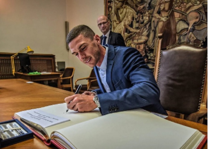 Il sindaco ha regalato al giocatore un telo da bagno rosso con i colori della città e dei dolci tipici di Emmerich. "Non li mangio da molto tempo - non ci sono Katjes (marca di caramelle e dolciumi tedesca) in Italia", ha detto Robin Gosens, ringraziandolo.