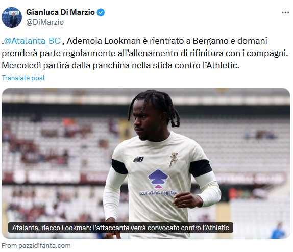 Lookman è rientrato oggi a Bergamo, domani sarà presente alla rifinitura pomeridiana. Verrà convocato per la partita di Champions, nella quale partirà dalla panchina. (fonte pazzidifanta.it, ripresa anche da Gianluca di Marzio di Sky)