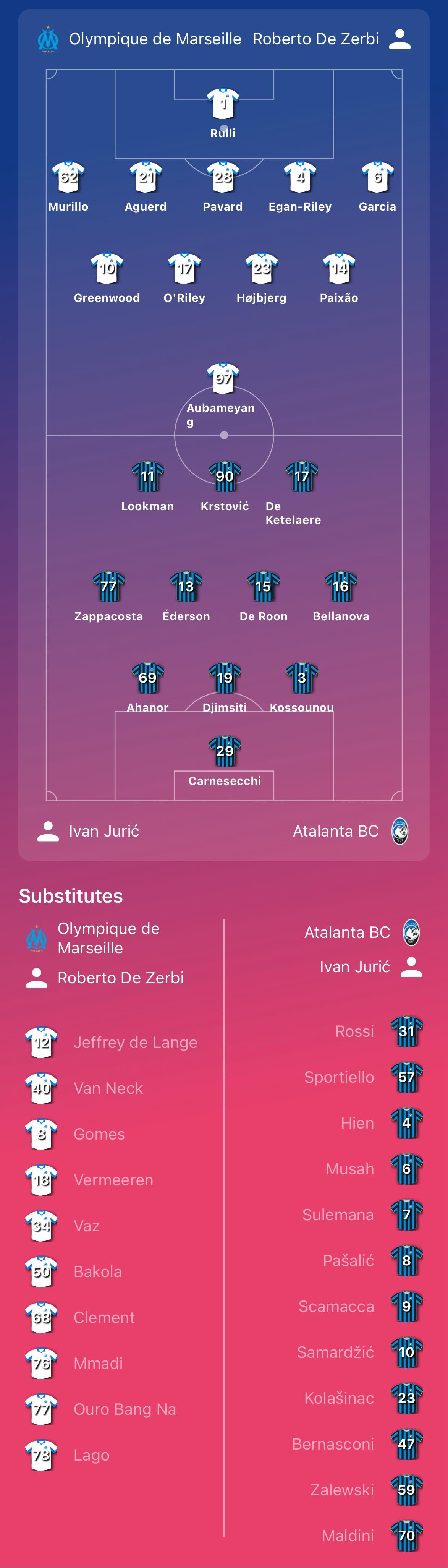 MARSIGLIA (5-4-1) - Rulli; Murillo, Aguerd, Pavard, Egan-Riley, Garcia; Greenwood, O'Riley, Hojbjerg, Paixao; Aubameyang. All.: De Zerbi.