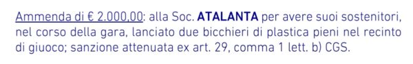 Così si è espresso il giudice sportivo. Da considerare che a Bologna c'è un fossato di tre metri e il terreno di gioco ne dista almeno 30 non si sa come siano potuti arrivare là due bicchieri, ma tant'è: