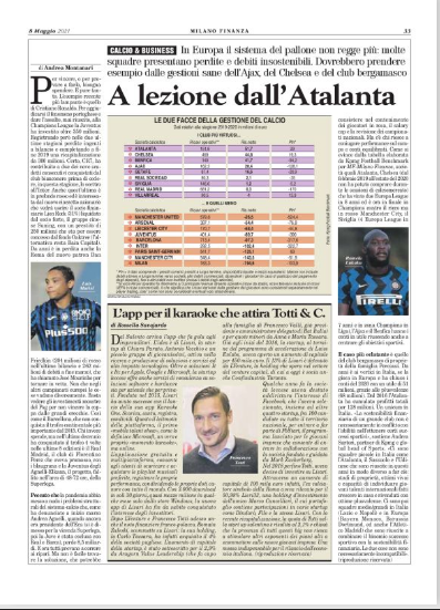 Quasi una pagina intera oggi sul cartaceo di "Milano Finanza" dedicata alla nostra squadra e societa' definita "virtuosa" per le sue imprese sul campo e gli attivi in bilancio.Il sottotitolo reca infatti : "Il sistema europeo non regge più: perdite e debiti ormai insostenibili. Per vincere i big spendono troppo. Ma ci sono casi di gestioni sane come Ajax, Chelsea, Benfica e il club bergamasco".