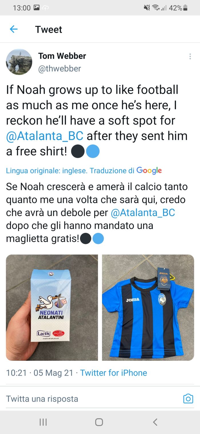 Giorgio M., che ringraziamo, ci ha inviato questo tweet. Uno straniero che ha ricevuto la maglietta destinata ai neonati e che si augura che il suo cucciolo, da grande, sia atalantino per davvero.