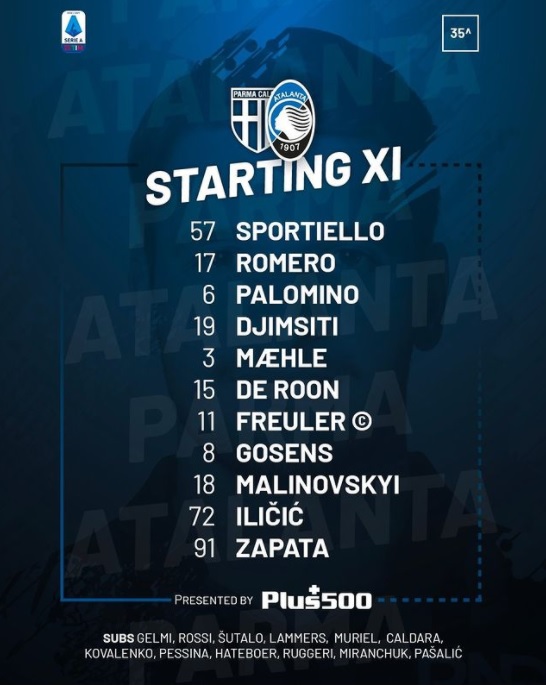 Atalanta: Sportiello, Djimsiti, Romero, Palomino, Mæhle, de Roon, Freuler, Gosens, Malinovskyi, Iličić, Zapata. A disposizione: Gelmi, Rossi, Šutalo, Lammers, Muriel, Caldara, Kovalenko, Pessina, Hateboer, Ruggeri, Miranchuk, Pašalić. Allenatore: Gian Piero Gasperini.