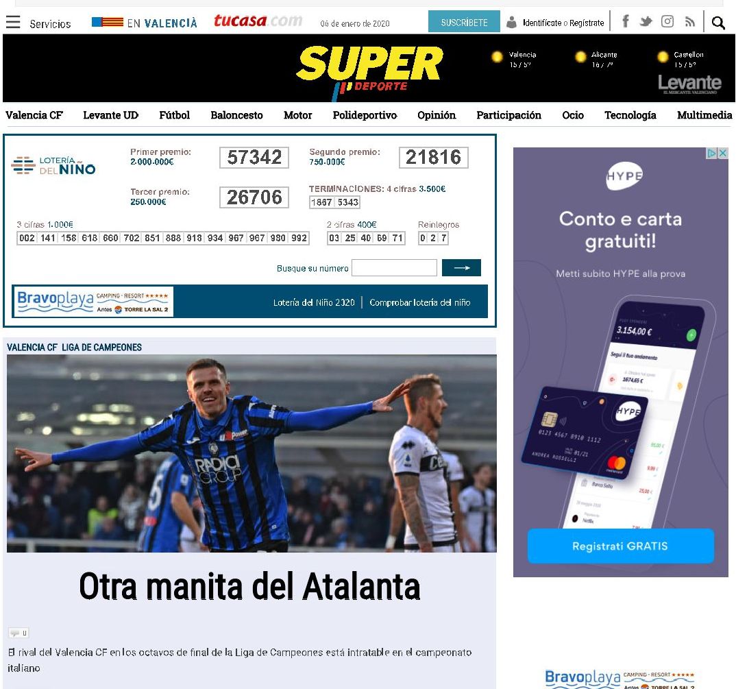 Superdeporte.es, il portale sportivo valenciano, ieri ha messo come notizia d'apertura nella sua home page la seconda manita consecutiva atalantina. Spassoso come definiscono la nostra squadra sotto la foto: "intratable" !!!