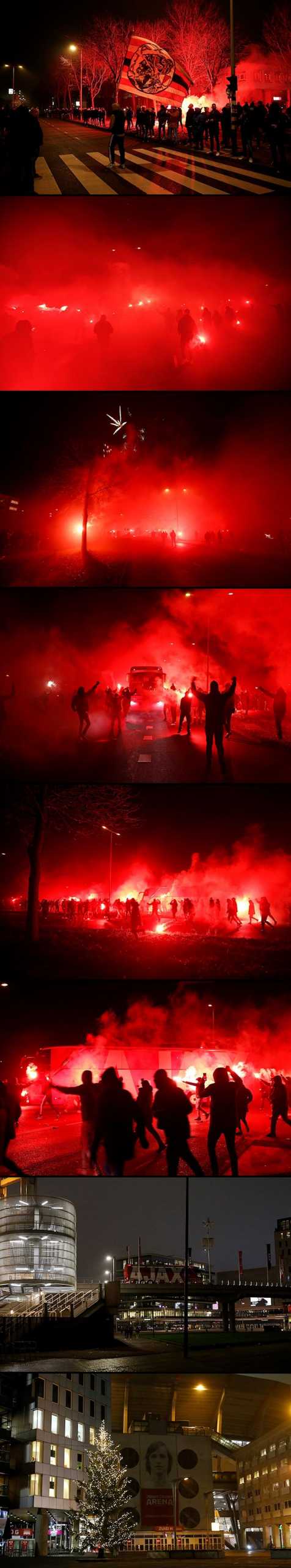Quelle che vi riportiamo sono del sito ajaxlife.li e riguardano una torciata dei tifosi olandesi assolutamente simile a quella tenuta dai nostri tifosi prima della sfida con i Lancieri a Bergamo (e magari ci avrebbero ritornato volentieri il vetro rotto...) e due immagini della bellissima Johan Crujyff Arena con tanto di immagine della grande leggenda del posto..