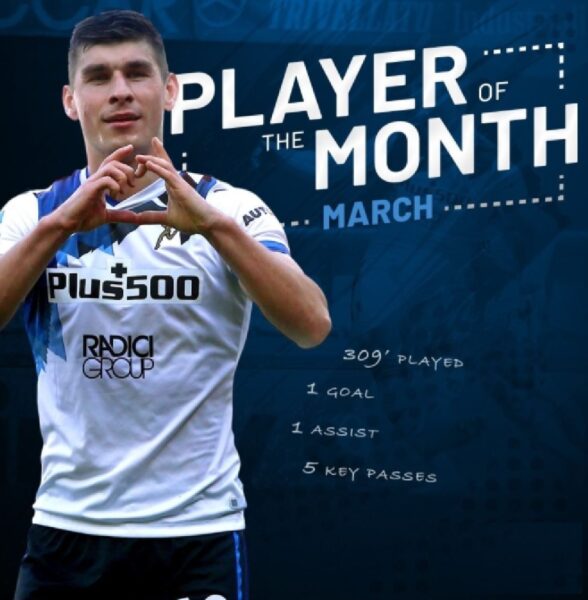 Dal profilo ufficiale Instagram dell'Atalanta (atalantabc) ecco che Ruslan Malinowskyi è stato nominato giocatore del mese per marzo; questo grazie, a quanto si legge nella fotografia che accompagna l'annuncio, ai 309' giocati, 1 goal 1 assist e 5 passaggi chiave