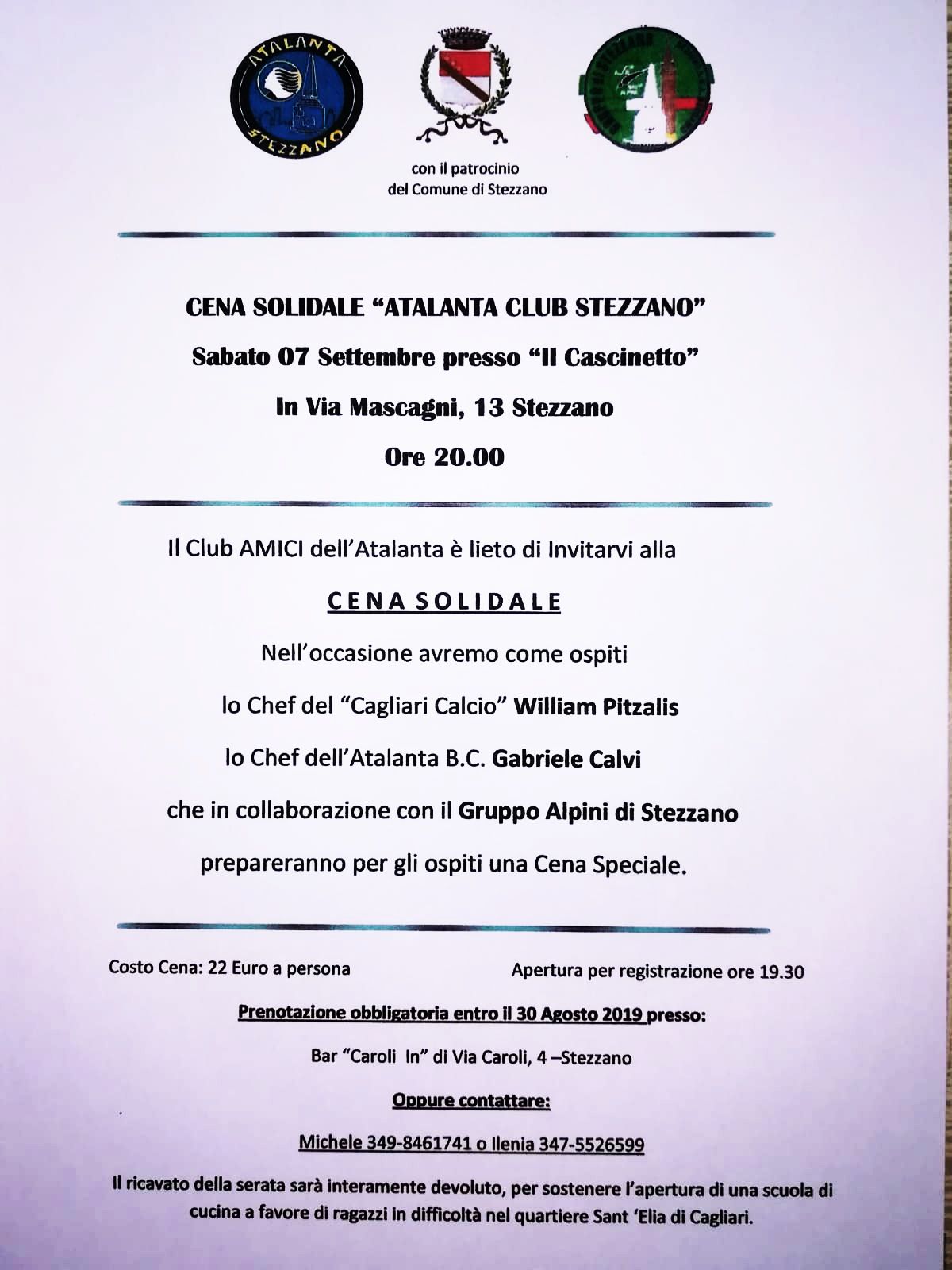 Vi inoltro il volantino della cena alla quale prenderanno parte lo chef dell'Atalanta bergamasca calcio e del Cagliari calcio. Il ricavato sarà devoluto in beneficenza, e durante la cena ci sarà una lotteria.