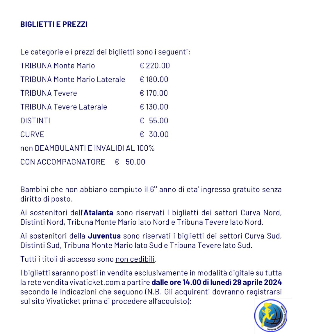 Per entrambe le squadre, alle ore 14.00 del 6 maggio 2024 – eventuale inizio della fase di vendita “libera” dei biglietti residui di entrambe le squadre.