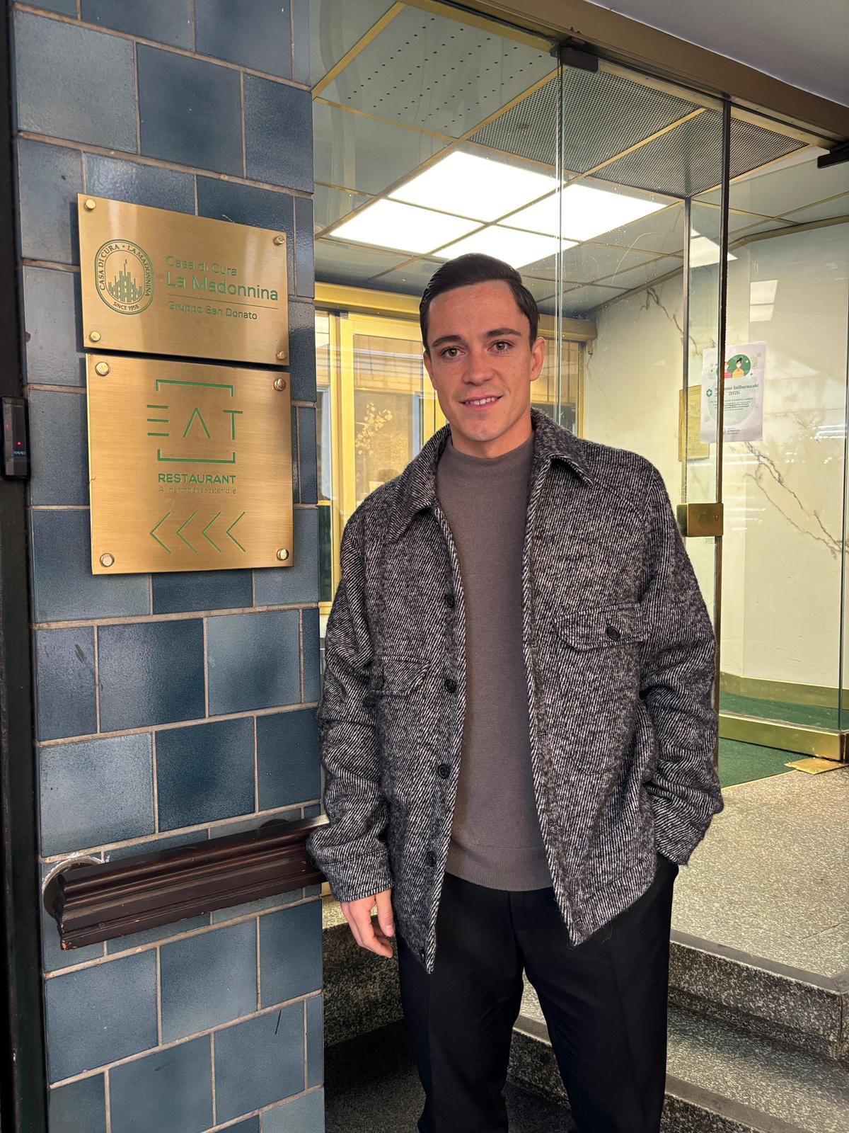 Giacomo Raspadori all’arrivo alla Casa di Cura La Madonnina di Milano per le visite mediche.