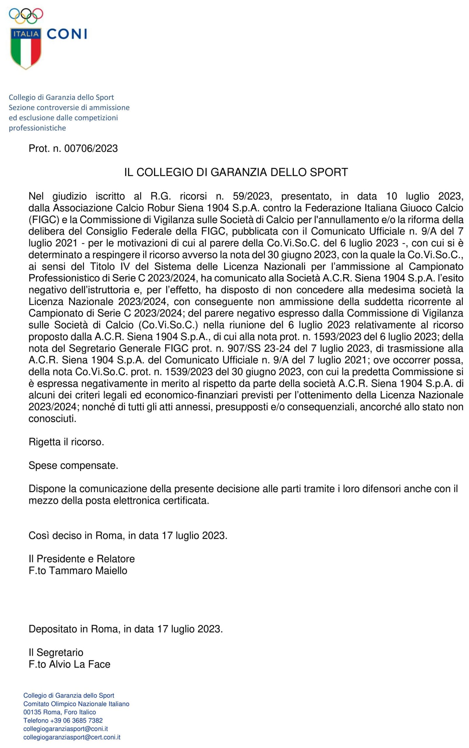 Respinto altro ricorso del Siena, la nostra Under23 è un passo piu' vicina alla discesa in campo