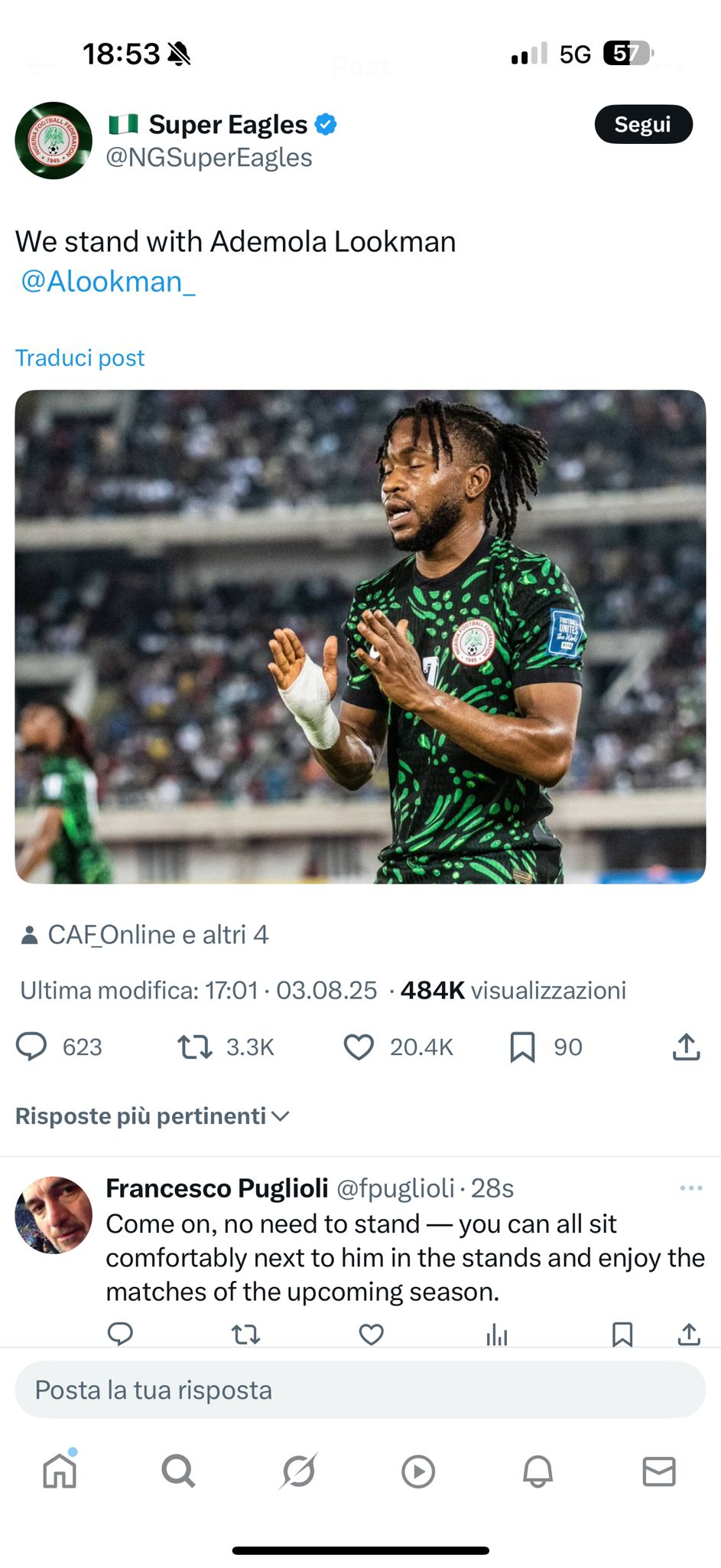 Un post dell'account UFFICIALE della Nazionale nigeriana che scrive