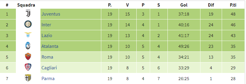 Facciamo un raffronto con il campionato scorso, 2019/2020, quello che ci ha visti concludere la stagione al terzo posto ed incontrare ai quarti di Champions il Paris Saint Germain. Vediamo come era la situazione al termine del girone di andata.