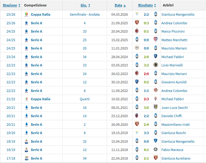Sarà la quinta gara per Marcenaro con l'Atalanta