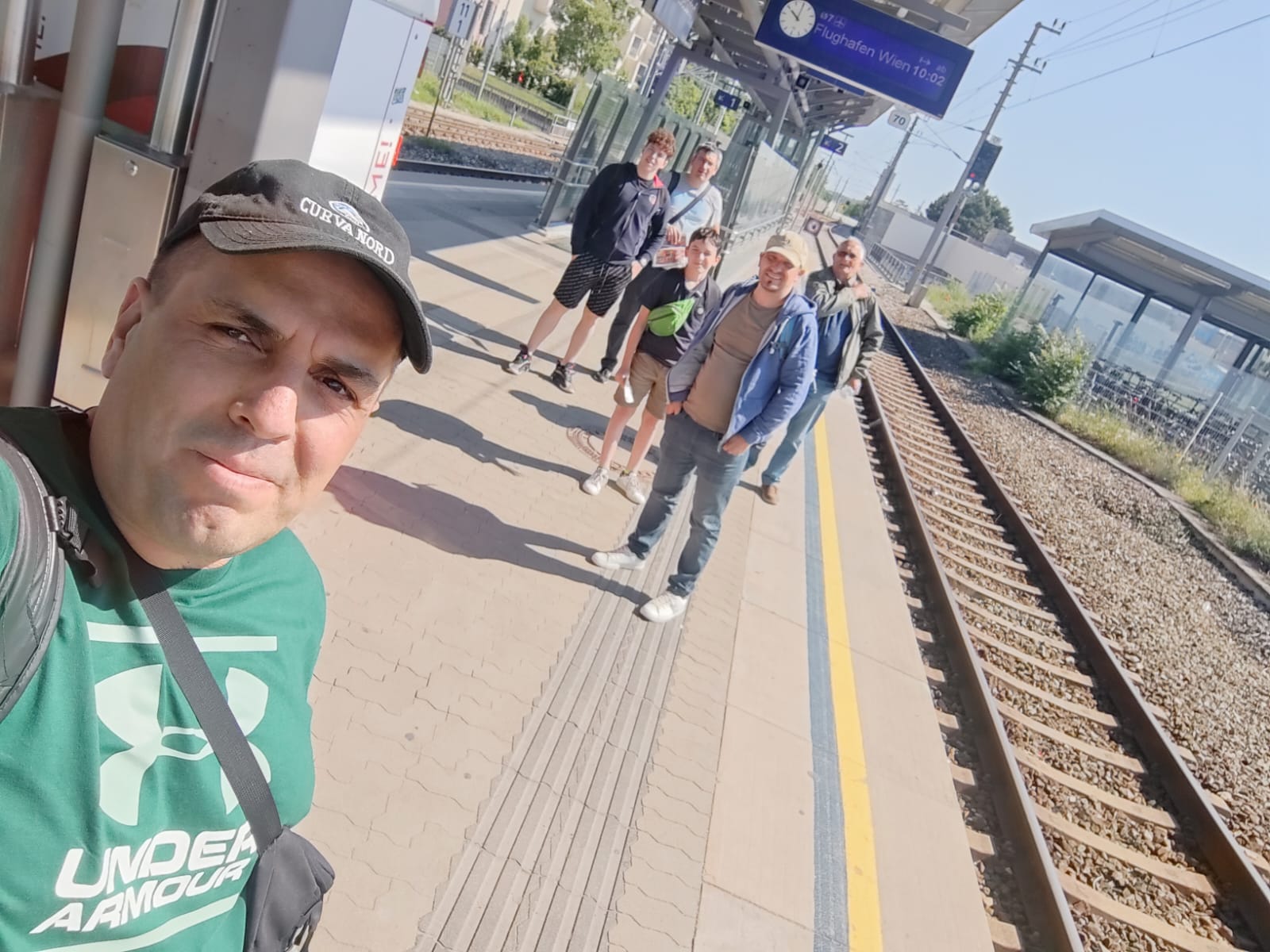 Molti anche gli atalantini non bergamaschi che stanno confluendo a Roma. Qui sotto gli Atalantini Ungheresi ripresi in viaggio alla stazione di Vienna e sotto un logo di atalantini provenienti dalla Grecia