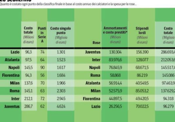 Costosi anche i 70 punti del Milan, che ha raggiunto il quarto posto valido per la Champions ma spendendo 1,9 milioni a punto. Oculata come sempre la gestione dell’Atalanta, che ha pagato ogni suo punto 1,5 milioni di euro (97,5 milioni il costo della rosa) e del Torino che ha abbassato il costo del monte ingaggi a 36 milioni di euro (l’anno precedente era di 55 milioni) spendendo poco più di 1,1 milione per ogni punto conquistato.