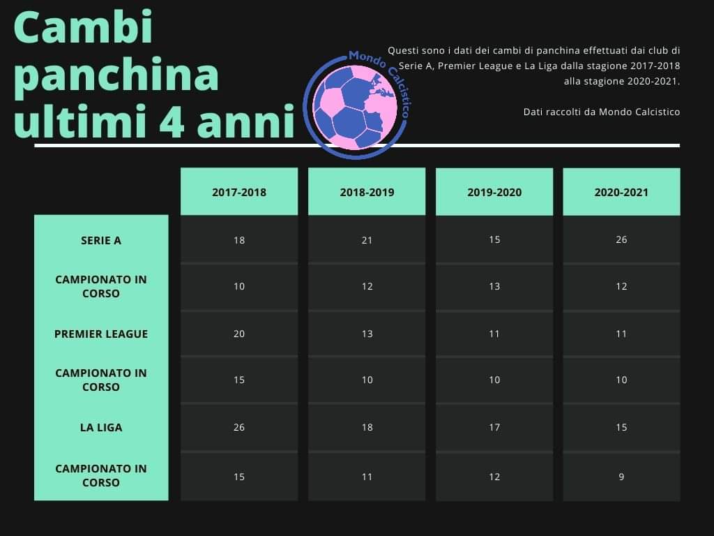 Questi sono i dati dei cambi di panchina nei campionati Serie A, Premier League e La Liga dalla stagione 2017-2018 alla stagione 2020-2021.