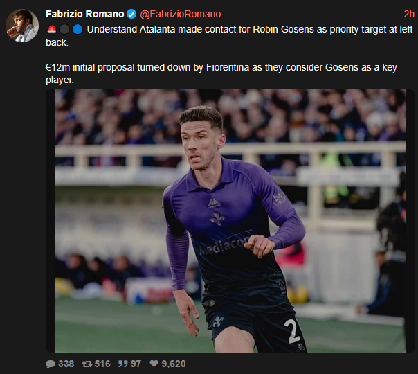 Come già noto ad alcuni, Fabrizio Romano ha segnalato un'offerta di 12M dell'Atalanta per Gosens, poi rifiutata dalla Fiorentina. I viola reputano il tedesco un tassello importante, mentre l'Atalanta lo considererebbe un obiettivo prioritario. Staremo a vedere come si evolve.