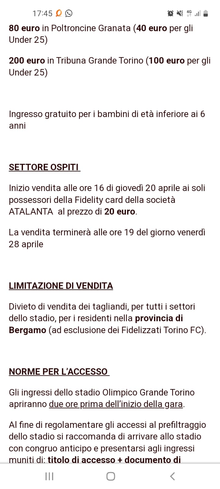 Il Torino FC informa inoltre “che a seguito delle decisioni rese note in data odierna da parte della Questura di Torino, i biglietti del Settore ospiti per la gara in oggetto saranno in vendita ai soli possessori della Fidelity Card Atalanta e divieto di vendita ai residenti nella provincia di Bergamo per tutti gli altri settori dello stadio”.