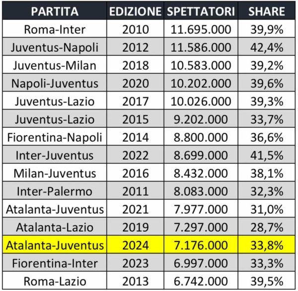 Spettatori, share e ricavi ultime edizioni finali coppa Italia