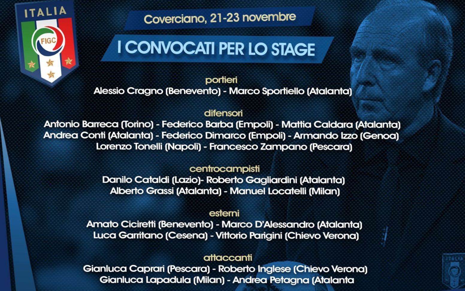17/11/2016 | 20.03 0 Stage azzurro 21-23 novembre : Ventura ne convoca SETTE dei nostri Con la collaborazione di Lissa By staff