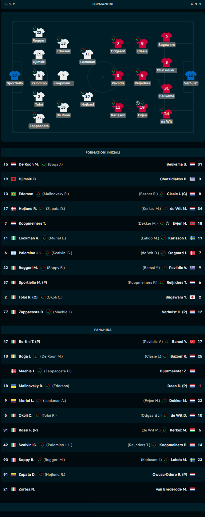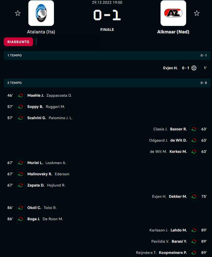 Tabellino e sostituzioni di Atalanta - AZ Alkmaar