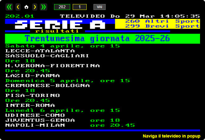 Questa volta "cannano" completamente la data della nostra prossima partita e ormai son giorni che l'info sbagliata e' sul televideo, controllate a pagina 202.