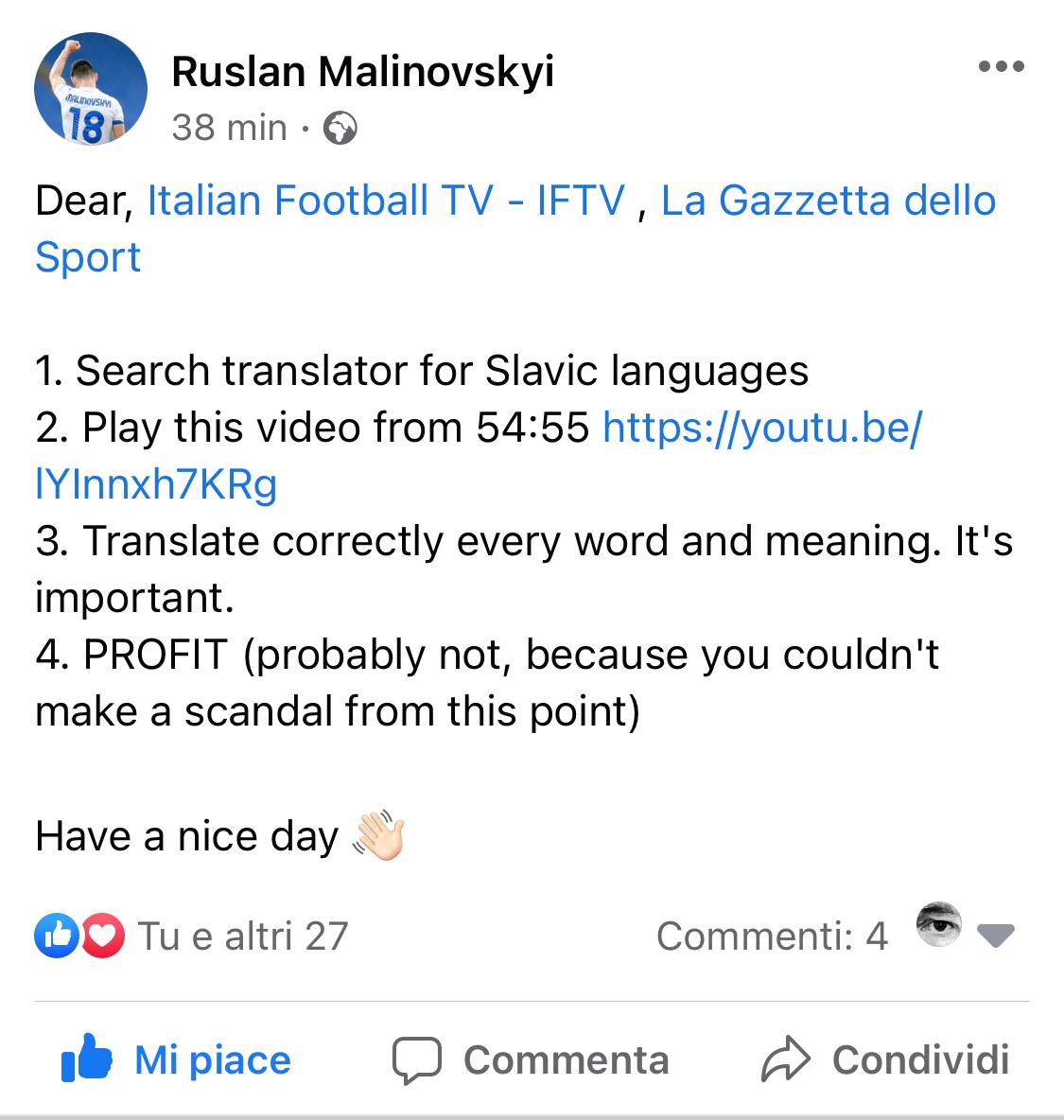 Malinovskji ha chiesto sui suoi social alla Gazzetta dello Sport e in generale ai giornalisti sportivi italiani di trovarsi un migliore traduttore dalla sua lingua.