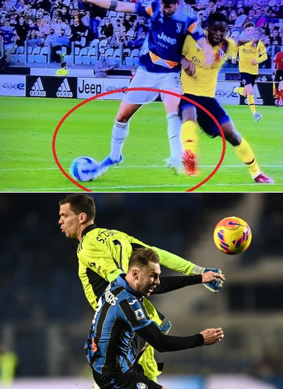 13/2/2022 Atalanta - Juventus: Koopmeiners scappa in contropiede, Szczęsny lo abbatte, la palla arriva a Muriel che calcia male ed il difensore riesce a respingere il tiro in calcio d'angolo.