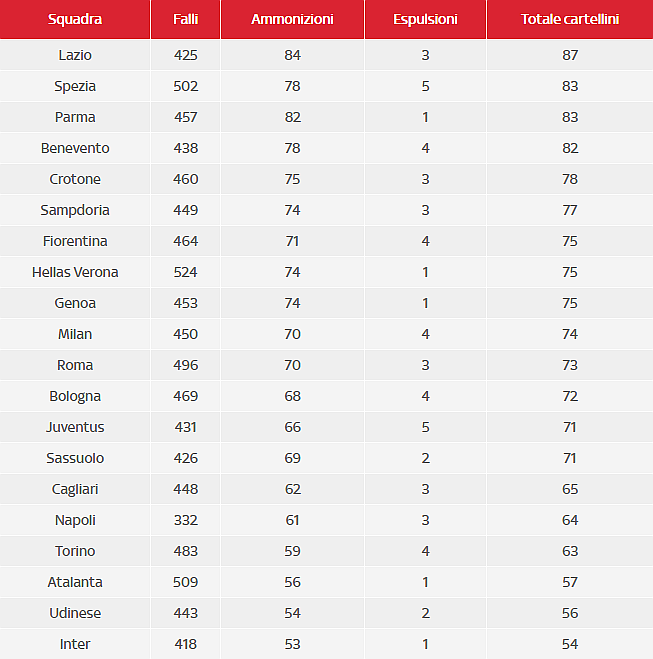 Ma la sua squadra, tra molti favoritismi nemmeno nascosti troppo bene, risulta essere tra quelle piu' tartassate dai cartellini, come ci dimostra l'immagine qui sotto presa da superscudetto.it.